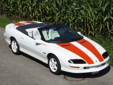 5.7L V8 LT1 mit 285PS (Corvette-Motor), limitierte Sonderserie "30 YEARS ANNIVERSARY EDITION" zum 30. Geburtstag des Camaro, das Spezialpacket mit Code "Z4C" umfasst eine an den 1969 Camaro "Indianapolis 500 Mile Race Pace Car" angelehnte Sonderlackierung in Arctic White mit Hugger Orange Stripes / in Wagenfarbe lackierte Türgriffe und Aussenspiegel sowie Alufelgen im 5-Speichen-Design / Ledersitze in Arctic White mit eingestickten "Anniversary-Logo's" (Standard in Leder/Stoff und als Option in Ganzleder wie bei diesem Exemplar), elektrisches Verdeck weiss mit beheizter Glasheckscheibe, elektrisch verstellbare Sitze, elektrische Fensterheber und Aussenspiegel, Klimaanlage, Tempomat, Zentralverriegelung mit Funkfernbedienung und Wegfahrsperre, Positraction-Hinterachse mit 2.73er Übersetzung, Z28 Special Performance Package, 2 Airbags, ABS, optionales ASR / Traction Control (abschaltbar), Nebellampen, Original-Stereoanlage, US-Version / Erstzulassung in der Schweiz, 100% Originalzustand, frisch ab MFK, garantiert erst 9'000mls / 14'400km, heute schon eine Rarität mit Sammlerpotential - 1 von nur 979 gebauten "30 YEARS ANNIVERSARY EDITION" Cabriolet!, absoluter Neuzustand. |
